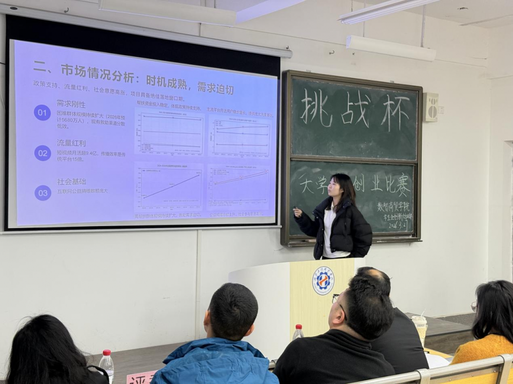 为激发青年学生创新创业热情,培育创新精神与实践能力,选拔优秀项目冲击更高规格赛事,3月27日,数智商贸学院 2026 年 “挑战杯”大学生创业计划竞赛院级选拔赛顺利开展。学院领导、专业骨干教师组成评审团,各参赛团队齐聚赛场,展开创新创业成果比拼,为校园双创氛围增添了浓郁活力。